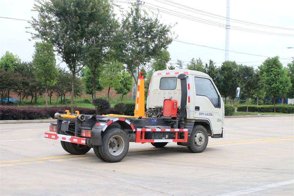該款鉤臂式垃圾車由液壓系統、操作系統組成。舉升油制缸(1支)系國內知名液壓件廠家生產的雙作用油缸。垃圾廂可自吊上放下,可自行傾倒垃圾,上下一次工作循環時間≤50S。該車的特點是一個車能配多個垃圾廂,能實現一臺車與多個垃圾廂聯合作業,循環運輸,充分提高了車輛的運輸能力。