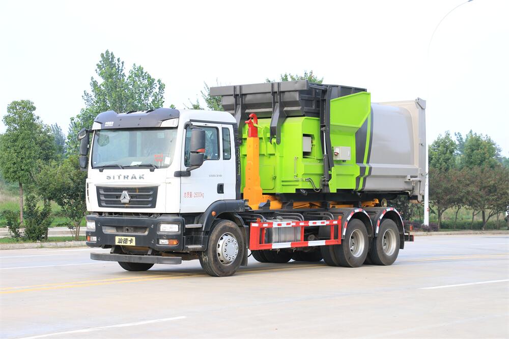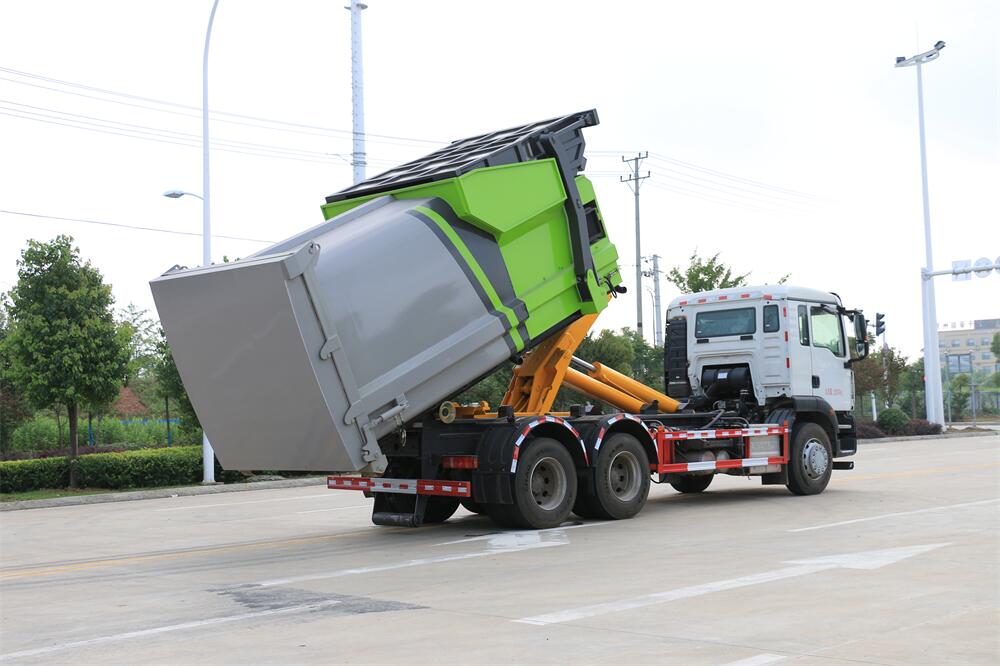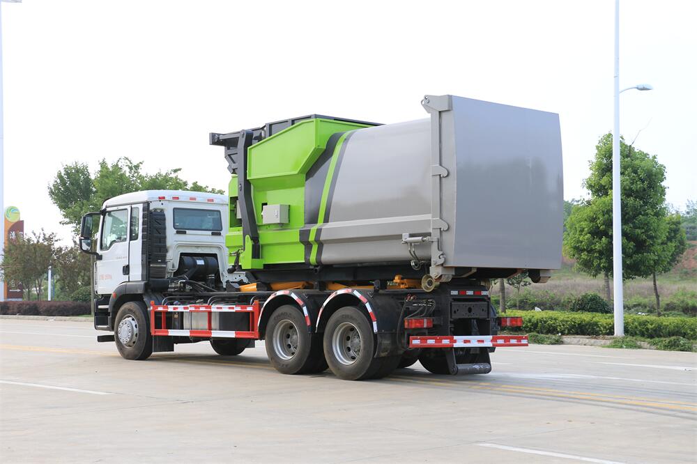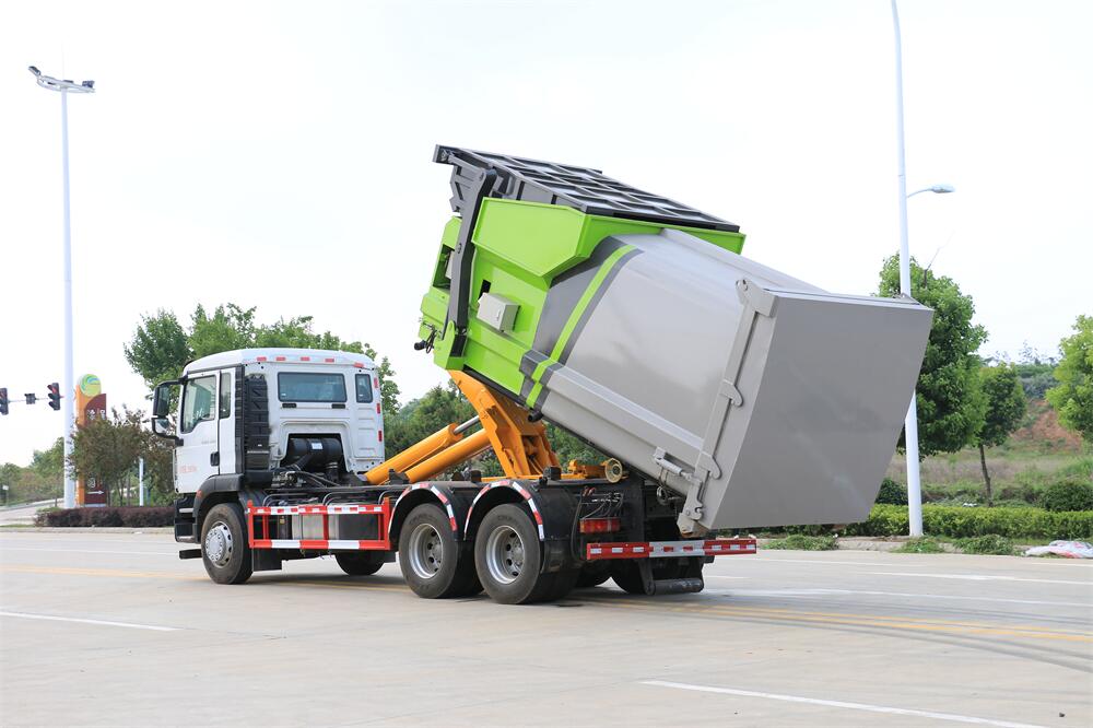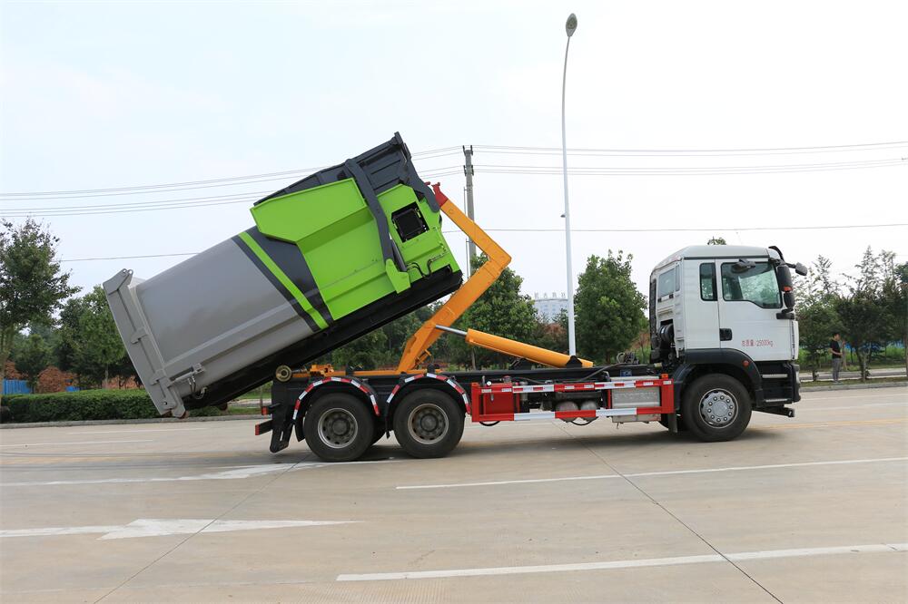 勾臂式垃圾車(車廂可卸式垃圾車)介紹: 車廂可卸式垃圾車又叫拉臂式垃圾車,是一種采用高新設計可伸縮的鉤臂,實現(xiàn)垃圾廂的二次吊裝,自吊上放下,可自行傾倒垃圾的環(huán)衛(wèi)設備。 拉臂式垃圾車結構簡單,操作穩(wěn)定方便,裝卸效率高,機械化程度高,節(jié)省人力。鉤臂垃圾車一車可帶多個垃圾廂,在裝卸的運輸過程中可有效地避免二次污染。 拉臂垃圾車采用高新設計可擺動的鉤臂,垃圾箱由框架、開啟油缸、滑輪、后門和若干加強框架與鋼板焊接而成。調(diào)換貨廂快捷方便,貨廂上帶蓋(倒垃圾時可翻開),鉤臂垃圾車垃圾廂體可選用碳鋼、不銹鋼材質(zhì)、內(nèi)部采取環(huán)氧樹脂防腐處理,改裝部分與原車底盤為可分離式,維修方便且保持了原車的機動性及行駛性能。