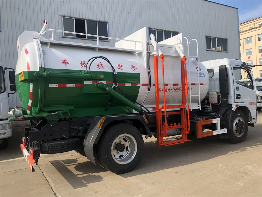 上裝配置:罐體容積8m3,配備120L/240L掛桶提升翻轉(zhuǎn)機構(gòu),液壓系統(tǒng),后蓋液壓鎖緊開啟,罐體可以舉升自卸,尾部帶自流閥;用于運輸液態(tài)垃圾,其特點操作簡單,密封性好,無泄漏,無異味;可選裝固液分離功能,推板擠壓功能,常用于餐館的垃圾轉(zhuǎn)運處理。