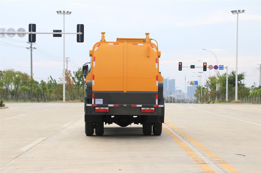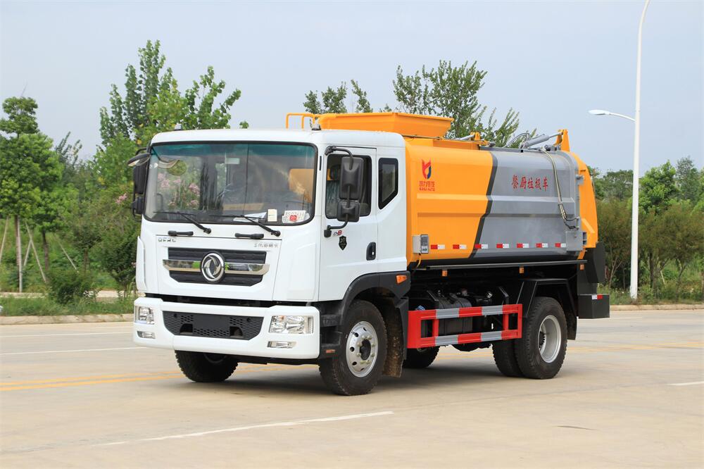 上裝配置:罐體容積10m3,配備120L/240L掛桶提升翻轉機構,液壓系統,后蓋液壓鎖緊開啟,罐體可以舉升自卸,尾部帶自流閥;用于運輸液態垃圾,其特點操作簡單,密封性好,無泄漏,無異味;可選裝固液分離功能,推板擠壓功能,常用于餐館的垃圾轉運處理。