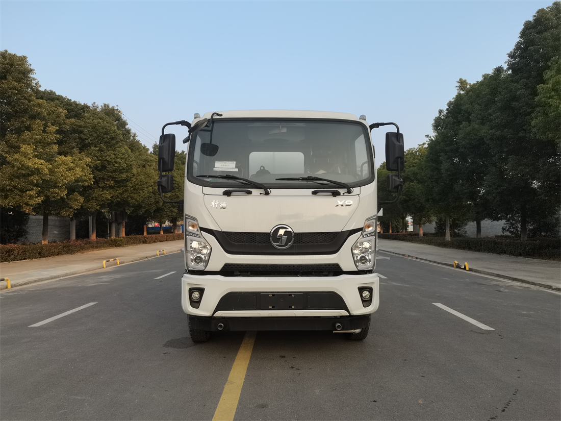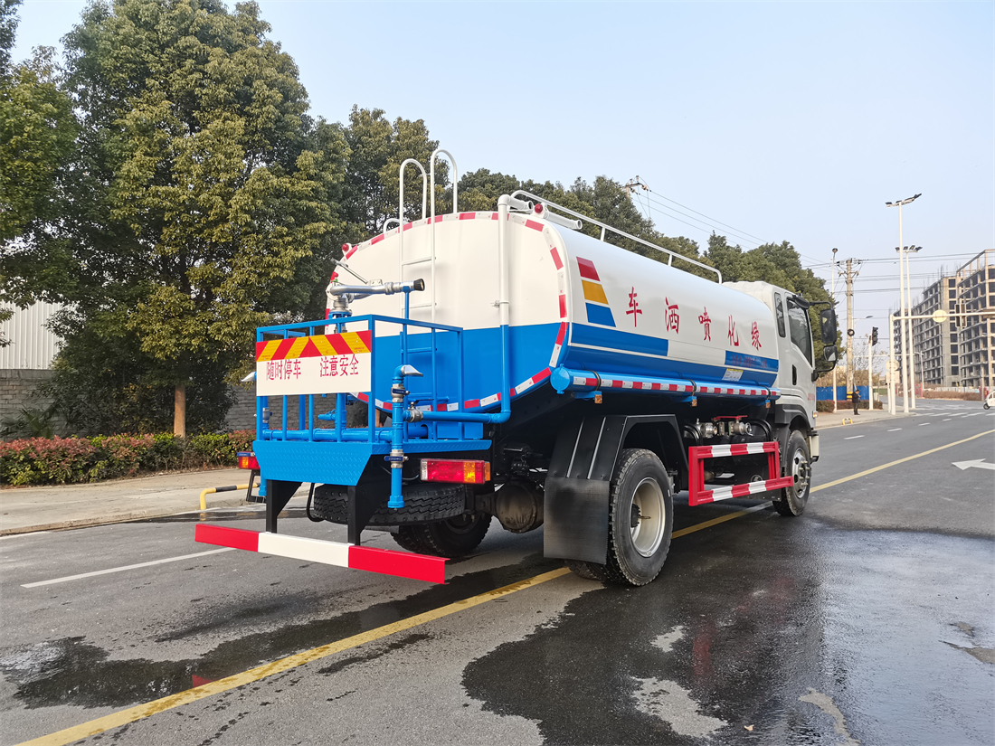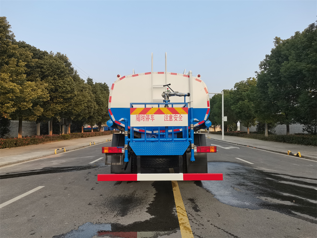 灑水車前裝有鴨形噴嘴或圓頭沖嘴,后面裝有圓柱開(kāi)灑水噴嘴或蓮蓬頭噴嘴,后部有一工作平臺(tái),裝配有水炮。后部還可裝8個(gè)噴嘴(選裝)。
