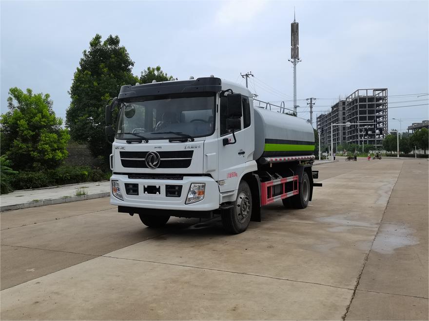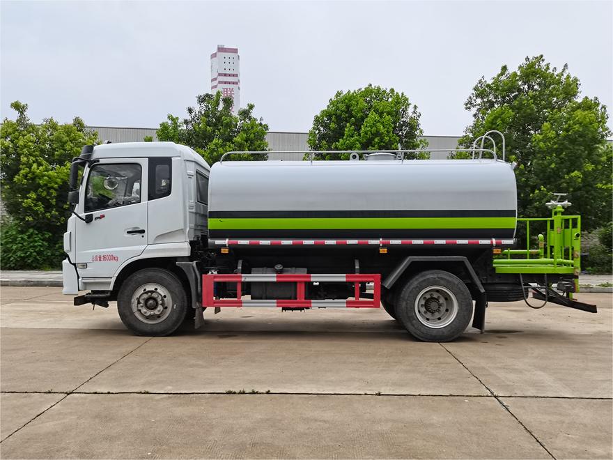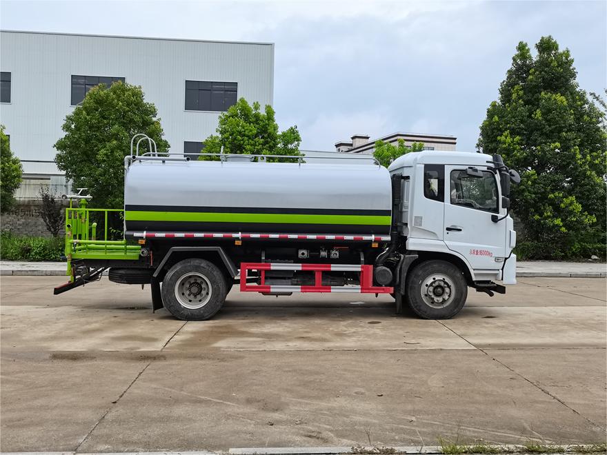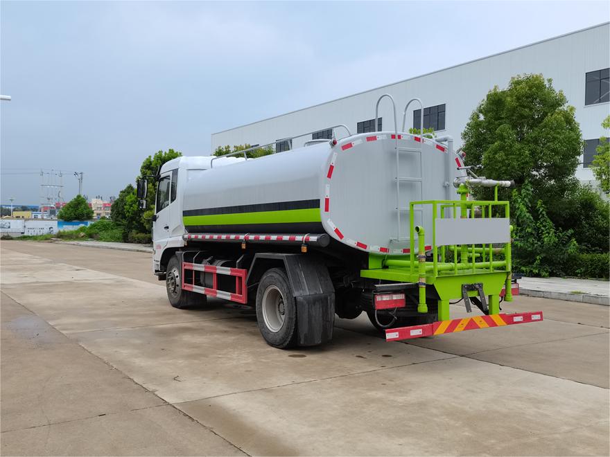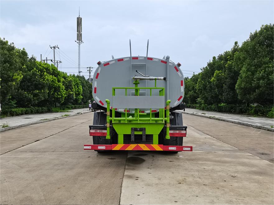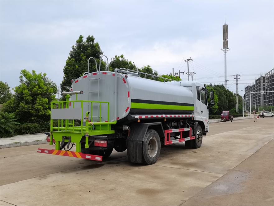 灑水車前裝有鴨形噴嘴或圓頭沖嘴,后面裝有圓柱開(kāi)灑水噴嘴或蓮蓬頭噴嘴,后部有一工作平臺(tái),裝配有水炮。后部還可裝8個(gè)噴嘴(選裝)。