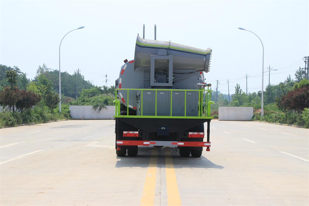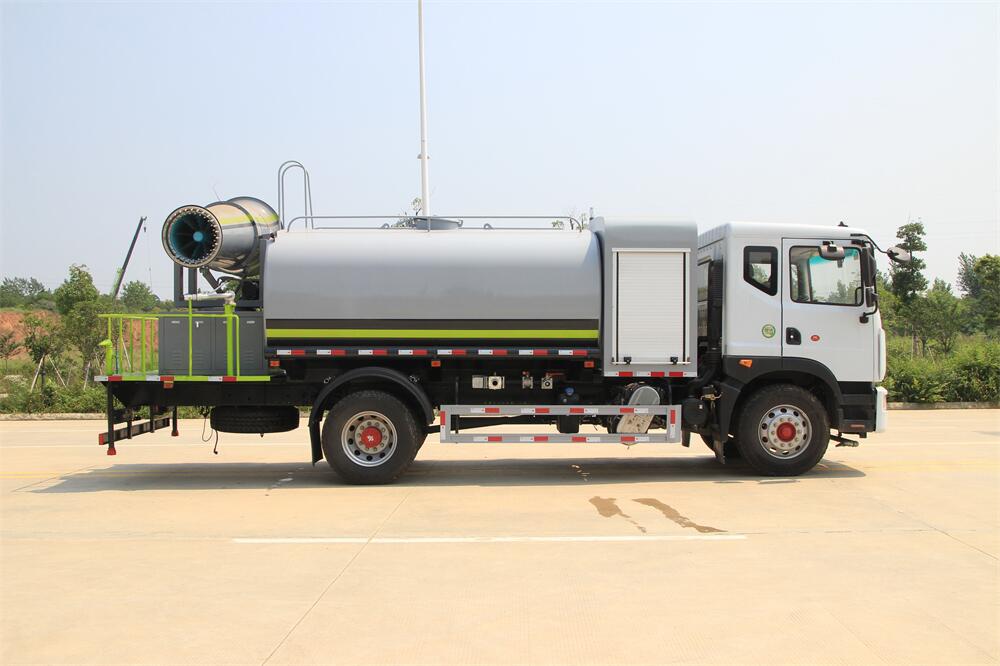 上裝配置:罐體容積為 12立方,選配風(fēng)送式霧炮機組射程30米、40米、50米、60米、80米、100米、120米霧炮,罐體鋼板為4mm碳鋼Q235材質(zhì),罐內(nèi)隔板具有防波作用,以減輕汽車行駛時罐體液體沖擊,罐體及整車外形尺寸按照公告。帶大功率專用灑水泵,泵可自吸自排,整車前沖、后灑、側(cè)噴、帶65消防接口,后平臺配CLW-50、CLW-60、CLW-80、CLW-100、CLW-120型風(fēng)送式霧炮機組;罐體前封頭配大功率柴油發(fā)電機組;前封頭帶水位計,后平臺主管路帶1寸澆花接口,后爬梯。帶兩根輸水管及陰陽端。罐體顏色:銀/灰/綠,罐體兩側(cè)噴“多功能抑塵車”字樣,貼反光標示。