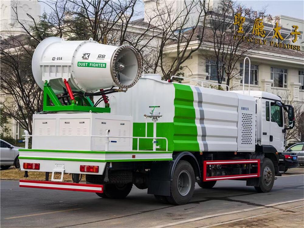 上裝配置:罐體容積為 12立方,選配風送式霧炮機組射程30米、40米、50米、60米、80米、100米、120米霧炮,罐體鋼板為4mm碳鋼Q235材質,罐內隔板具有防波作用,以減輕汽車行駛時罐體液體沖擊,罐體及整車外形尺寸按照公告。帶大功率專用灑水泵,泵可自吸自排,整車前沖、后灑、側噴、帶65消防接口,后平臺配CLW-50、CLW-60、CLW-80、CLW-100、CLW-120型風送式霧炮機組;罐體前封頭配大功率柴油發電機組;前封頭帶水位計,后平臺主管路帶1寸澆花接口,后爬梯。帶兩根輸水管及陰陽端。罐體顏色:銀/灰/綠,罐體兩側噴“多功能抑塵車”字樣,貼反光標示。