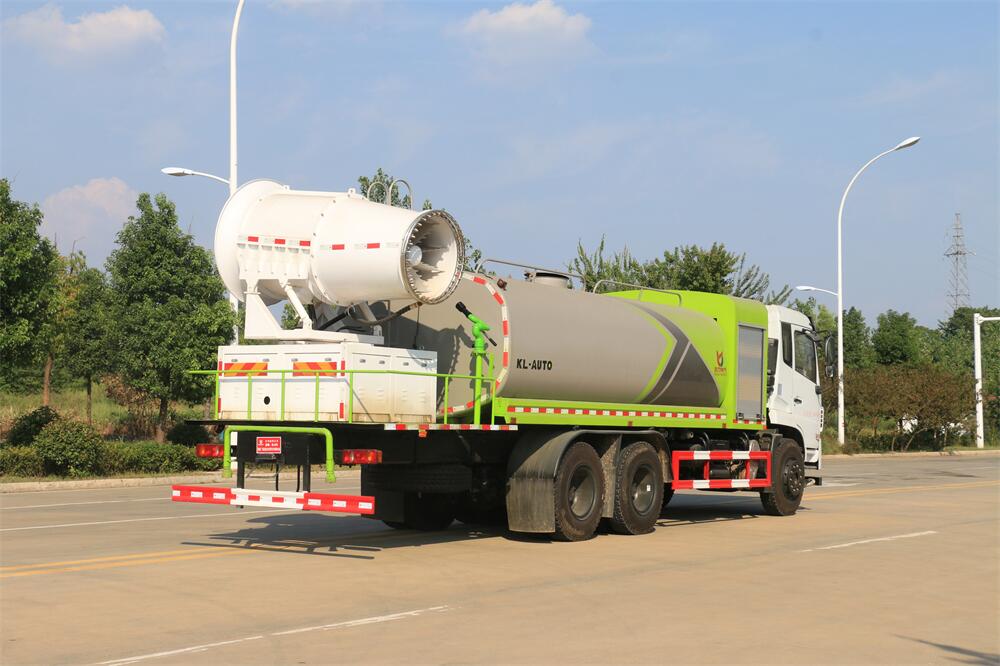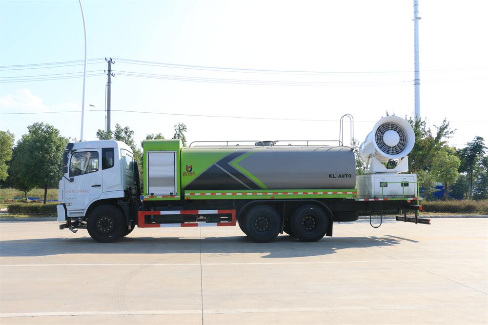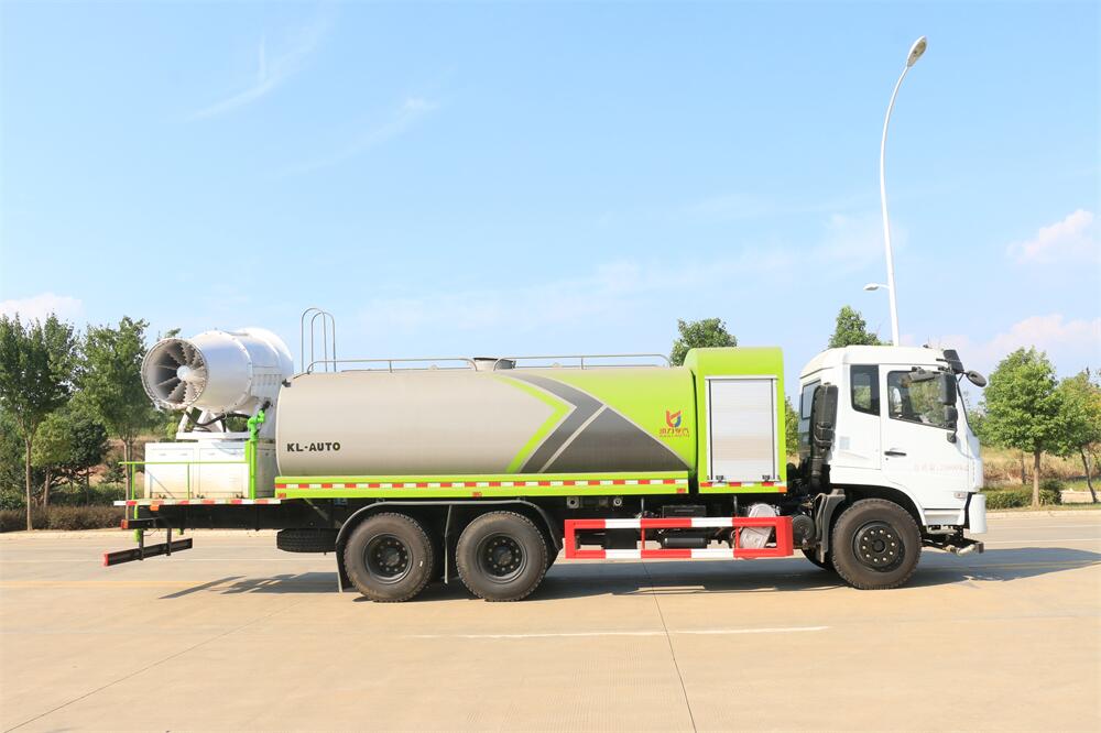 上裝配置:罐體容積為 16立方,選配風(fēng)送式霧炮機組射程30米、40米、50米、60米、80米、100米、120米霧炮,罐體鋼板為4mm碳鋼Q235材質(zhì),罐內(nèi)隔板具有防波作用,以減輕汽車行駛時罐體液體沖擊,罐體及整車外形尺寸按照公告。帶大功率專用灑水泵,泵可自吸自排,整車前沖、后灑、側(cè)噴、帶65消防接口,后平臺配CLW-50、CLW-60、CLW-80、CLW-100、CLW-120型風(fēng)送式霧炮機組;罐體前封頭配大功率柴油發(fā)電機組;前封頭帶水位計,后平臺主管路帶1寸澆花接口,后爬梯。帶兩根輸水管及陰陽端。罐體顏色:銀/灰/綠,罐體兩側(cè)噴“多功能抑塵車”字樣,貼反光標(biāo)示。