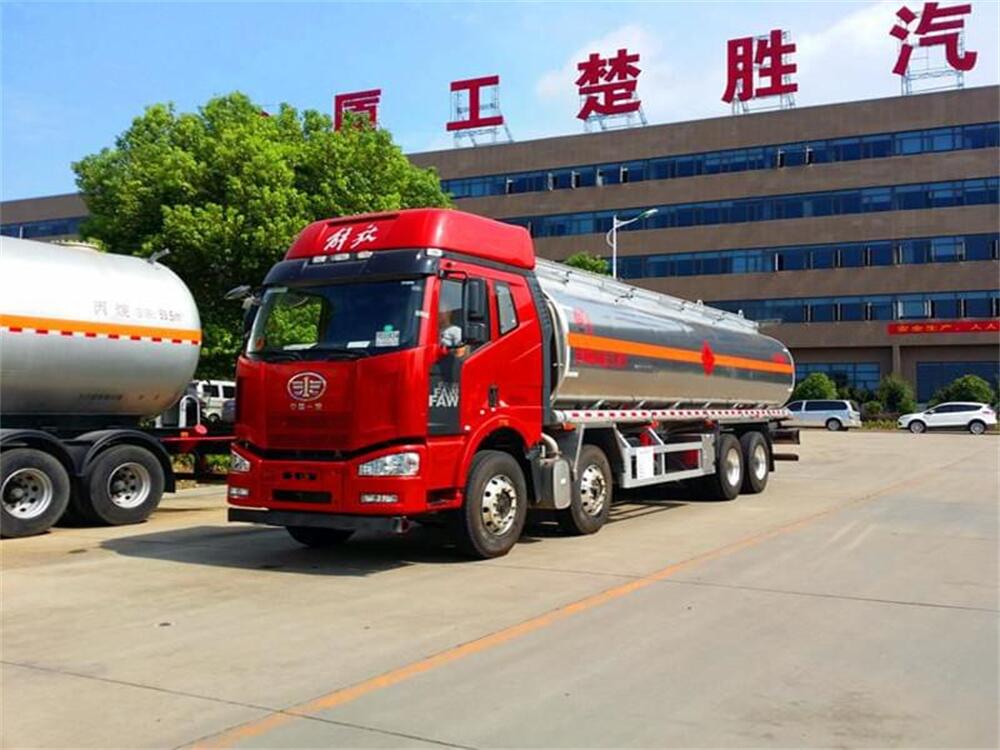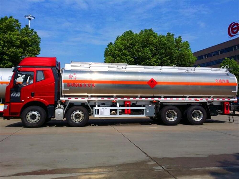 1.底盤配置:底盤采用解放J6前四后八危險品專用底盤,新規空氣懸架符合新規,全車選用輕量化鋁合金輪轂,搭配大柴320馬力發動機,解放9檔變速箱,整車不超重,額載21噸,兩個鋁合金歐標灌口,一個鋁合金海底閥(緊急切斷閥),一個鋁合金泄油閥,一個防溢流閥,一套油氣回收裝置,配兩個滅火器,兩根與罐體等長的輸油管,防火帽,接地靜電線,粘貼易燃液體貼,后部貼反光標志,安全告示板。車體前段帶有爬梯,檢查罐體更方便!