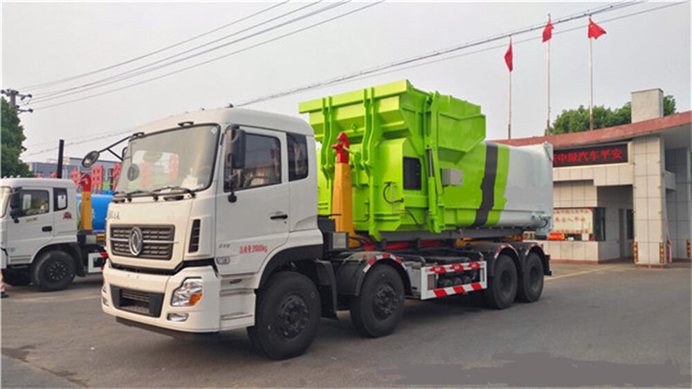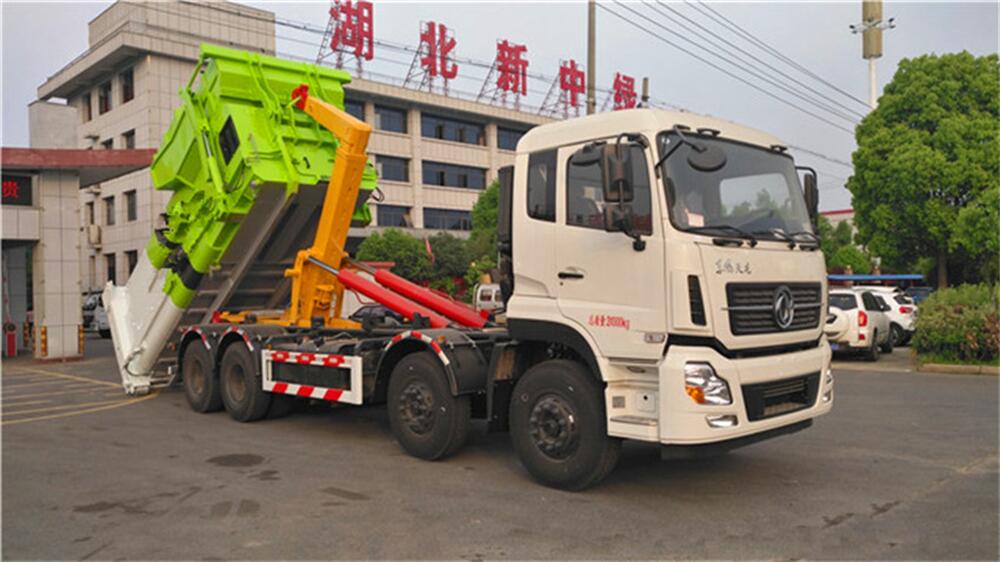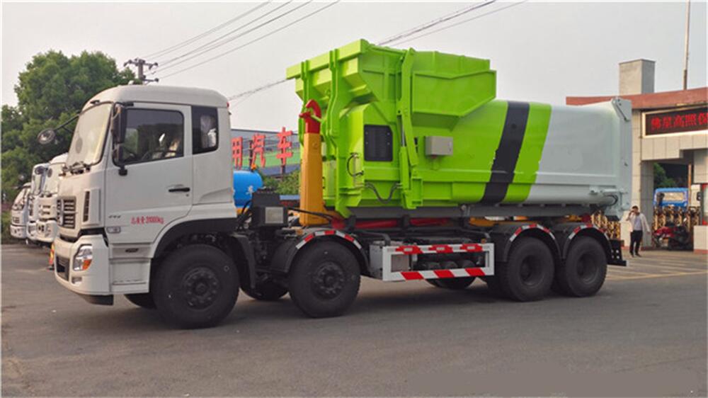 5、將汽車底盤倒進(jìn)車位,鉤起機(jī)箱,將垃圾運(yùn)往垃圾處理場。